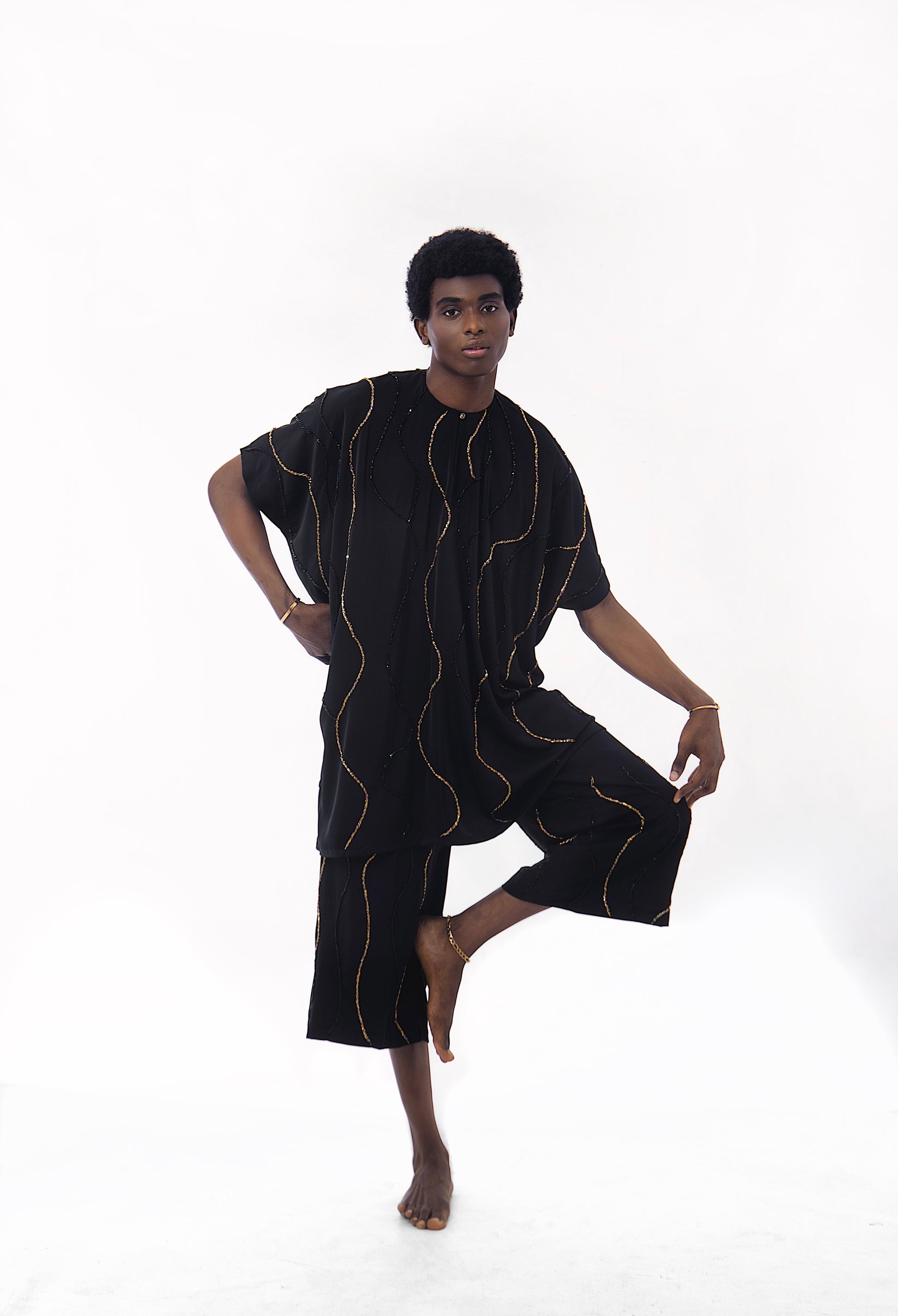 Crafted with a silk finish fabric that billows with every movement; the RUME dashiki set is completely hand beaded with black and multicolored beads in tints of gold, green and purple using Ola Reay’s signature swirl motif.